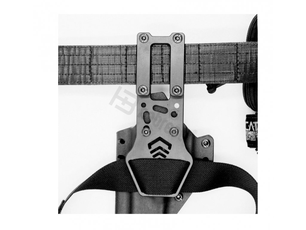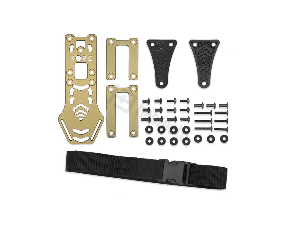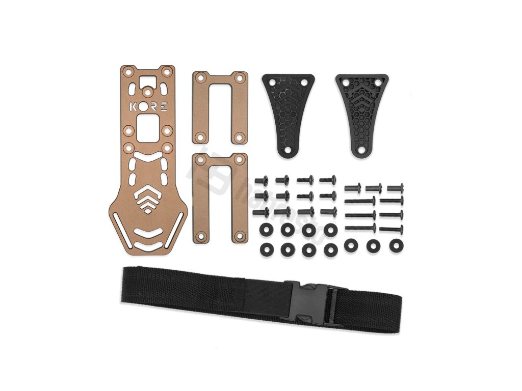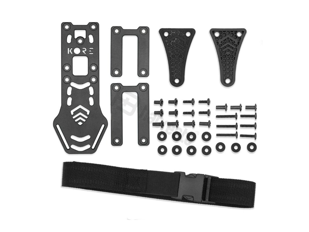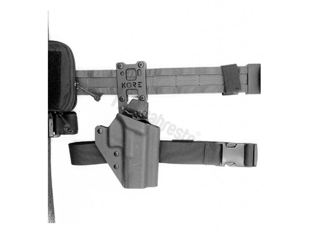 KORE Essentials Holster Mount je montážní platforma na Safariland styl pouzder. Poskytuje 3 výšky nastavení. Vyrobeno z lehkého a odolného hliníku 6061-t6 s černou anodizací. Montážní platforma obsahuje dvě varianty podle výšky opasku - 1,75" a 2,25". Součástí balení je také 1,5" široký stehenní popruh v délce 30". Tato montážní platforma je primárně určená ke KORE BATTLE BELT bojovým opaskům.