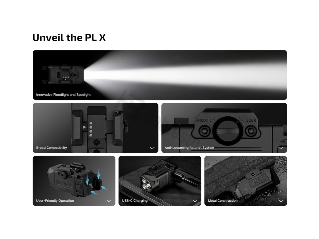 Vybaveno patentovaným ráčnovým systémem proti uvolnění, který zajišťuje stabilní uchycení bez vikvání na široké škále zbraňových lišt. Tato montáž byla navržena pro maximální kompatibilitu a spolehlivost, aby svítilna zůstala přesně tam, kde ji potřebujete.