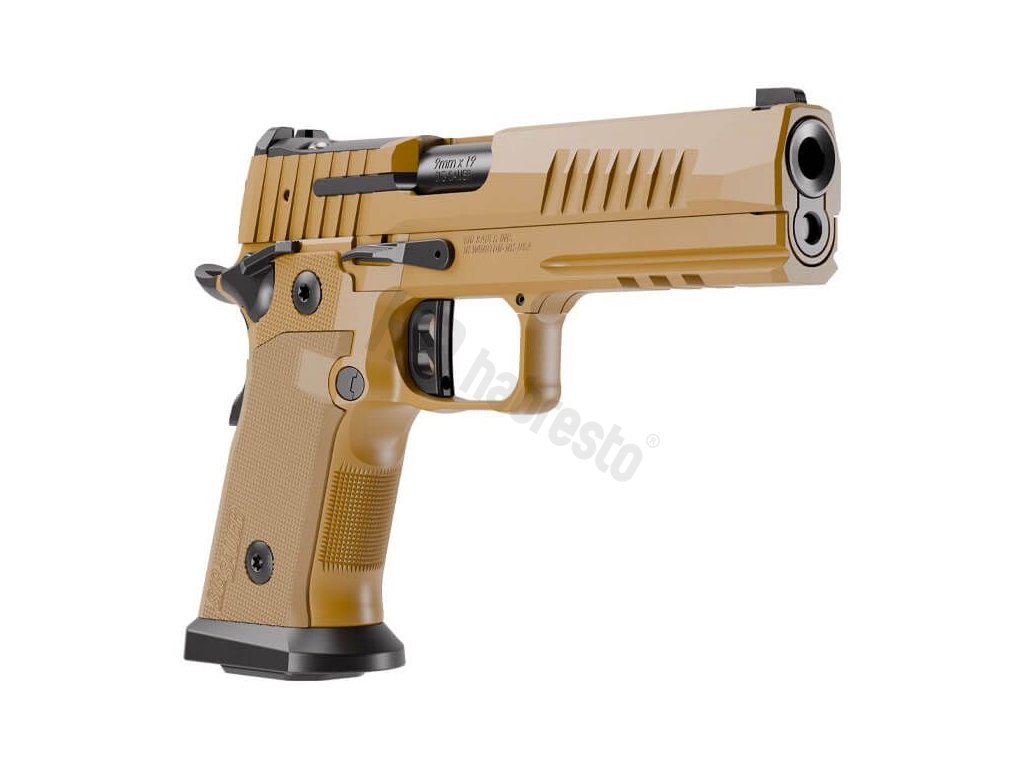Model GT5 v ráži 9 mm disponuje 5" bull barrel hlavní s terčovým zahloubením ústí a Full-size závěrem SIG-LOC™ PRO v odstínu Coyote, připraveným pro montáž optiky. Tato konfigurace bez kompenzátoru zaručuje předvídatelný zpětný ráz a maximální přesnost při zachování dokonalého vyvážení a spolehlivosti, kterou vyžaduje obranné i profesionální využití.