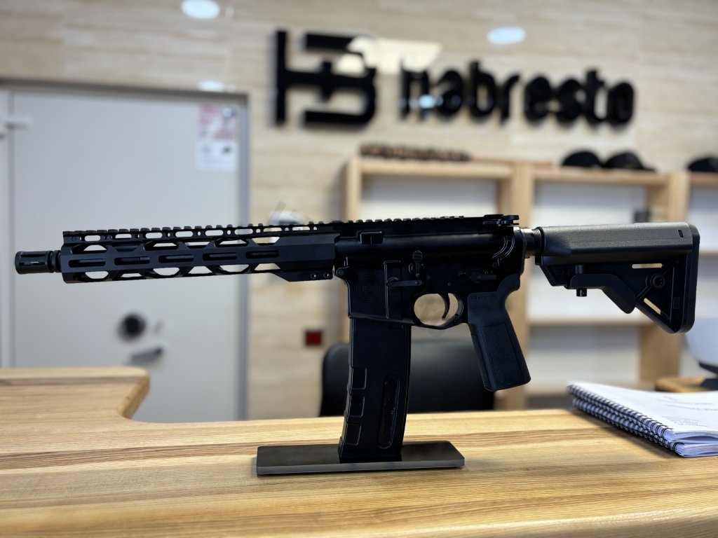 Kvalitní, MilSpec pušky M4 SBR s 10" RPR Free Floate předpažbím s rozhraním Magpul MLOK, pažbou a pažbičkou Mission First Tactical, závit na hlavni 1/2"-28, stoupání hlavně 1:7" osazena úsťovým zařízením A2